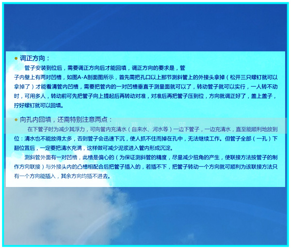 塑料型测斜管结合测斜仪使用,实施监测堤坝、边坡、基坑、桩、围堰等稳定性,测斜管与测斜管接头采用凹凸槽连接,并用自攻螺丝固定,测斜管内有供测斜仪探头定向的90度间槽的导槽,以保证重量轻、坚固、耐环境腐蚀及测斜管导槽无扭旋。