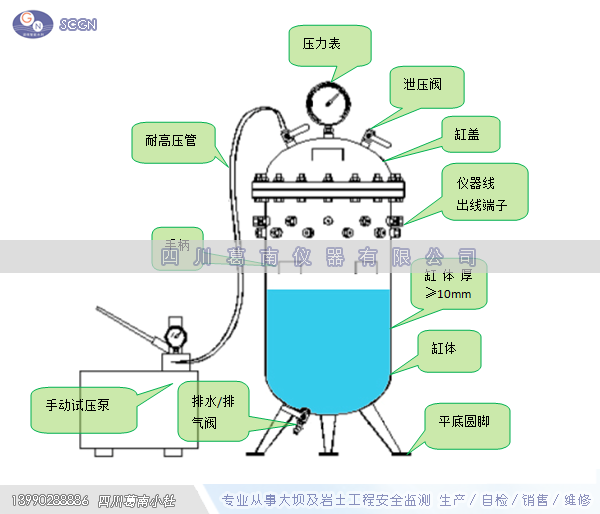 水压力试验罐,是以水为介质传递压力的试验罐。水压力试验罐总高约1150mm,最大外径约¢520mm,总重约150公斤左右。
