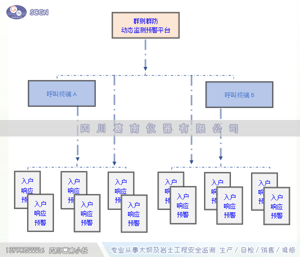 例:在某区域安装雨量采集设备,当地监测组安装呼叫终端,当地影响区域住户家中安装入户型报警应答器。