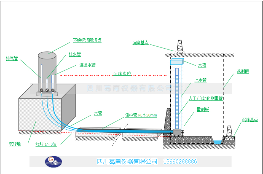 水管式沉降仪可单独安装,亦可与钢丝水平位移计联合安装进行观测。