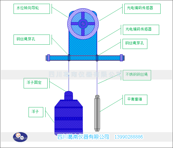 仪器的灵敏度、测量准确度及稳定性直接与浮子的直径有关,配置的浮子直径为φ 100mm,浮子下部装有配重,使其在平衡锤作用下,浮子浸入水中的深度是稳定的状态。