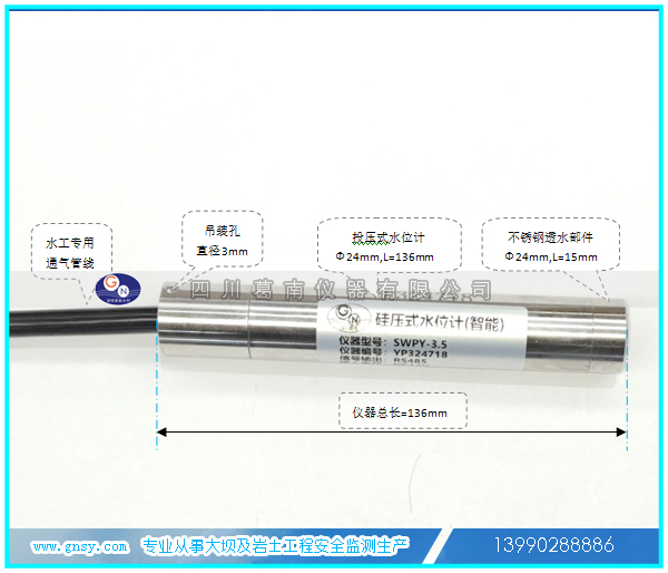 智能型投入式水位计全不锈钢结构,24×136mm的灵巧体积,可方便的放置在1英寸以上的测压管内。投入式水位计为智能传感器,输出信号为RS485物理量,温度、气压自动补偿。
