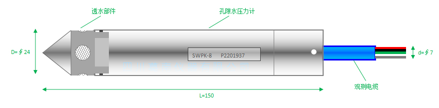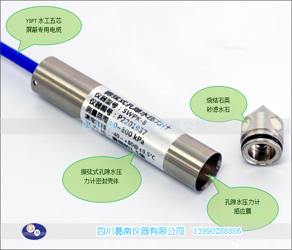 SWPK型振弦式孔隙水压力计由透水部件、感应膜板、观测电缆、振弦及激振电磁线圈等组成。