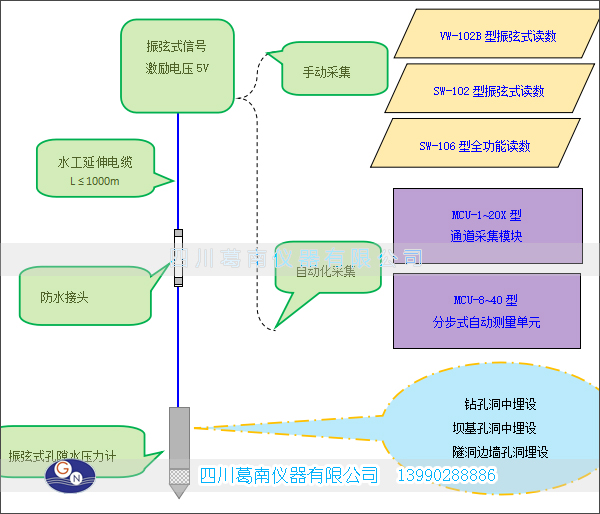 电磁线圈激振振弦并测量其振动频率,频率信号经电缆传输至读数装置,即可测出水荷载的压力值,也可以换算成水位,同步测量埋设点的温度值。