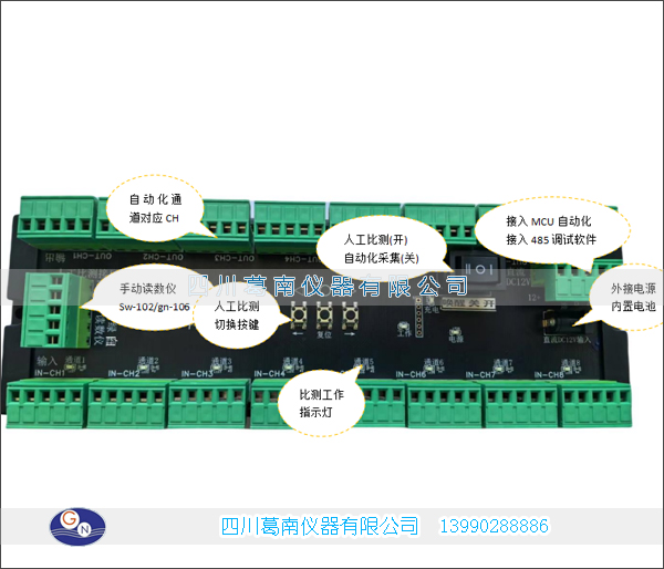 人工比测(读数仪测量): 具有人工比测接口,连接 SW-102或 GN-106读数仪实现数据人工数据采集,通道可以任意切换。
