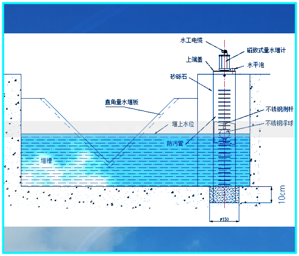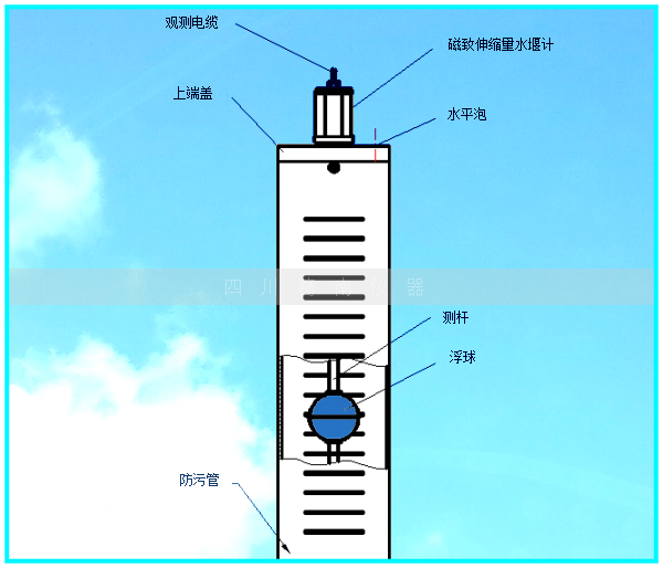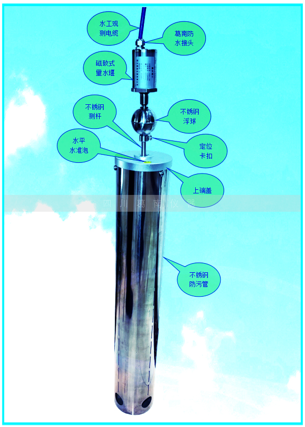 GNL-60型磁致式量水堰计由防污管、上端盖、磁致伸缩液位传感器、水平泡、观测电缆等组成。 | |