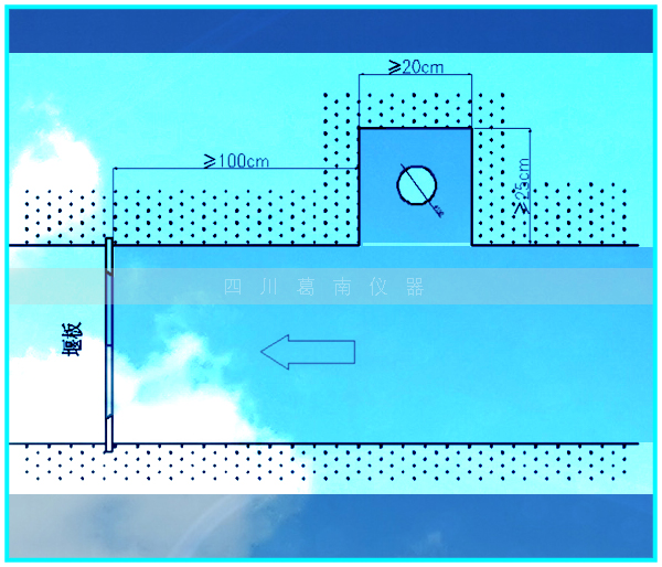 槽式安装法 量水堰计应安装在堰板的上游≥100cm处,在堰槽的侧壁做一内凹槽,在底部开一个安装洞,安装洞的直径应大于¢15cm的孔,低于水面深为10cm(尺寸见图2所示)。在安装洞中插入防污管,查看上端盖上的水平泡调整防污管的垂直度,管四周用水泥砂浆固结,防止砂浆进入防污管。在防污管四周填入清洁细碎石,直至将凹槽填满。 |