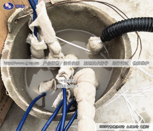 拆开包装泡沫,测值;浸泡水≥10cm,时间≥2H;透水土工布包裹砂袋和义器。