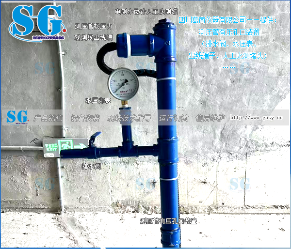 测压管孔口装置(承压范围≤2MPa)主要用于水库廊道内扬压力的长期监测。该装置结构紧凑,功能齐全,通常包含排水阀、水压表、观测电缆出线口以及用于人工比测电测水位计的专用观测端子等关键组件。