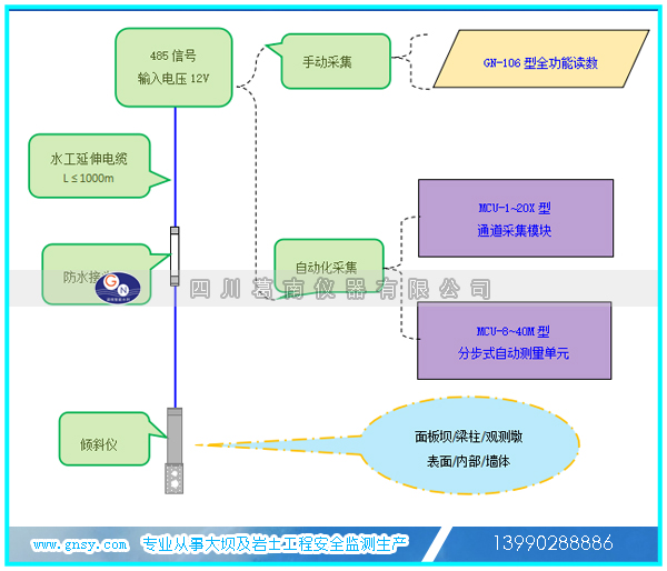 倾斜仪适用于长期安装在混凝土大坝、面板坝、土石坝等水工建筑物,及工民用建筑、道路、桥梁、隧道、路基、土建基坑等测量其倾斜变化量,方便实现测量数据的自动化采集。