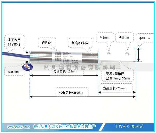 SN-1X型倾斜仪为全不锈钢结构,坚固耐用,附有调节和固定支架方便安装;传感器部分尺寸:26×135mm(直径D×长度L)。