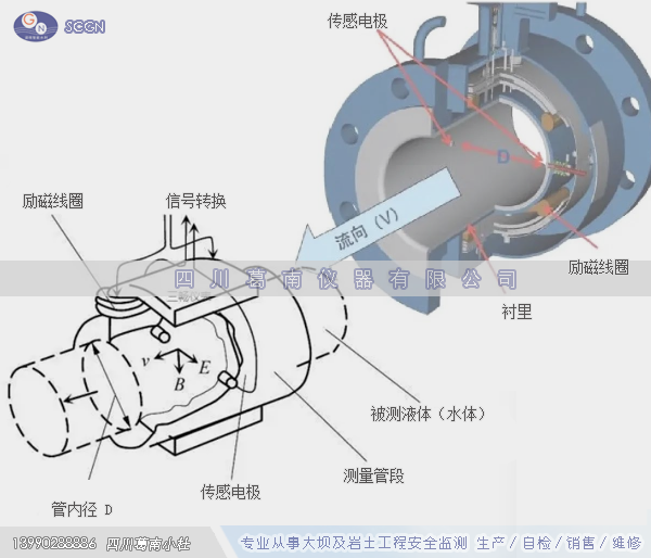 基于法拉第电磁感应定律,测量管内的导电介质相当于法拉第试验中的导电金属杆,上下两端的两个电磁线圈产生恒定磁场。