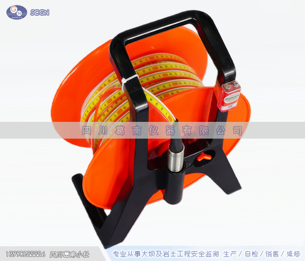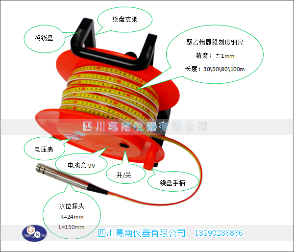 电测水位计的水位探头和塑胶测尺相连,测尺固定在卷筒上,探头的两电极之间有一个绝缘间隙,当探头和水接触时形成短路,电路接通音响峰鸣器和指示灯,即可在顶部测尺上读取水位深度。
