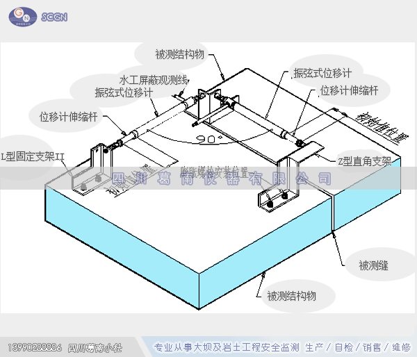 产品结构:振弦式表面测缝计由测杆、护管、后端座,观测电缆、测温元件、振弦及激振电磁线圈、双向支架及基座等组成。