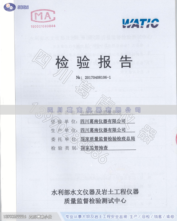 四川葛南仪器生产的分步式自动测量单元,2017年经国家质量监督检验检疫总局审查组抽检封存,送水利部水文仪器及岩土仪器质量监督检验测试中心检测“合格”,检测报告编号:20170408106-1